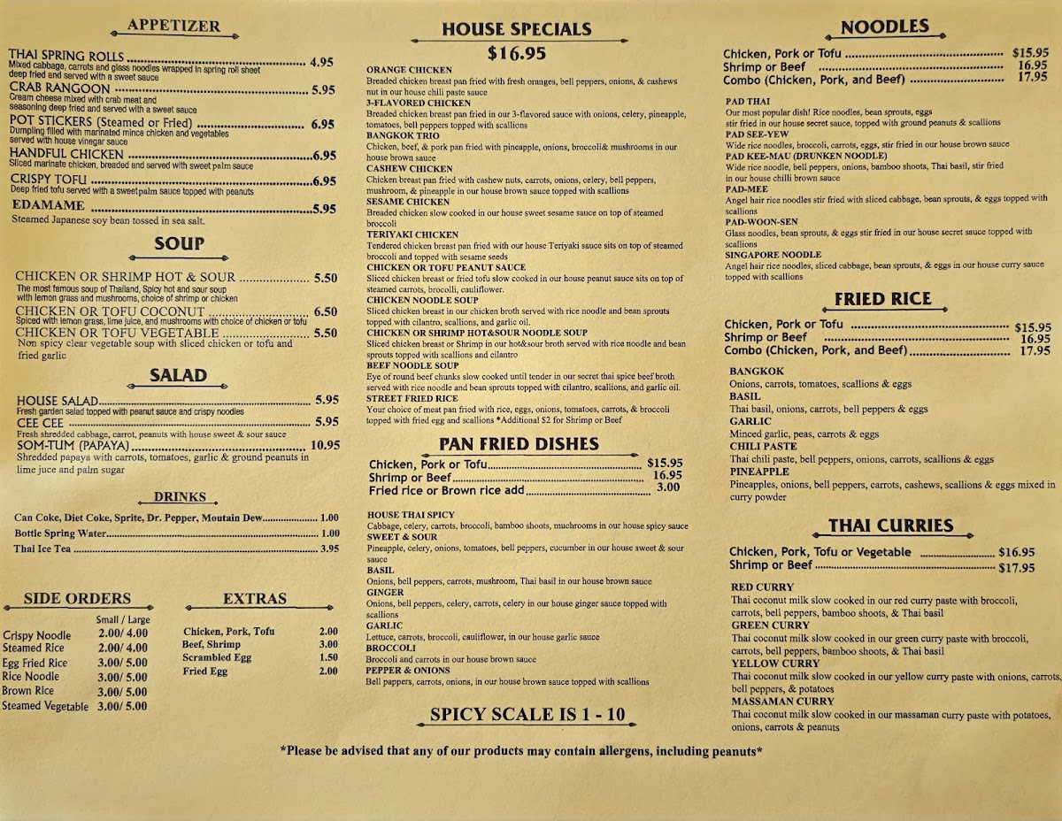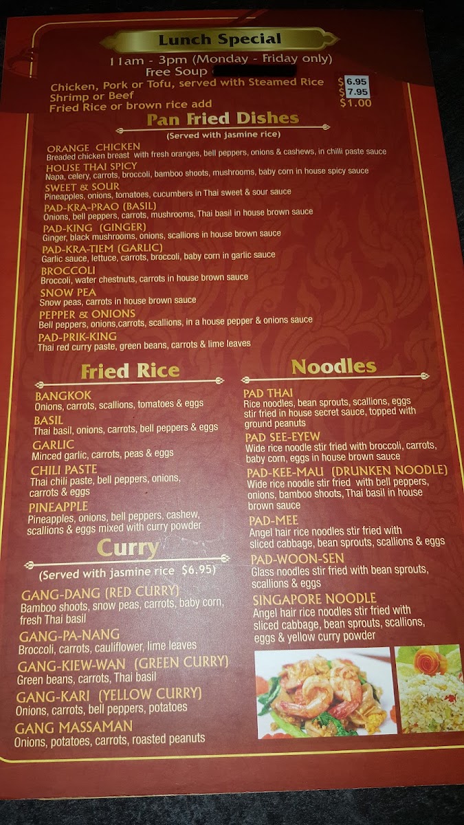 This menu suits casual dining as well as takeout, accommodating those seeking light meals, full entrees, or shared appetizers. Spice levels can be customized, allowing guests to choose heat levels according to preference. Overall, the menu provides a broad representation of Thai cuisine, suitable for lunch or dinner occasions.